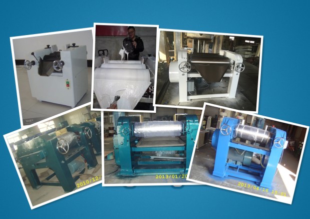 該設(shè)備由三個輥筒組成,裝在一個機(jī)架上,由電機(jī)直接帶動。一般輥筒間的轉(zhuǎn)動方向不同,前輥向前轉(zhuǎn)動,中輥向后轉(zhuǎn)動。輥子轉(zhuǎn)速前輥快、后輥慢。中間輥固定,前后兩輥裝在滑道上,有彈簧裝置,用手輪調(diào)節(jié)前后輥與中輥的距離。物料由后輥與中輥之間進(jìn)入,受到輥筒的擠壓,產(chǎn)品顆粒變細(xì),然后由快輥帶出,快輥末端裝有刮刀,使物料與輥筒分離,落入收集桶內(nèi)。由于研磨過程產(chǎn)生大量熱量,各輥筒的中心是設(shè)計為空心結(jié)構(gòu),通水冷卻,保證產(chǎn)品質(zhì)量。